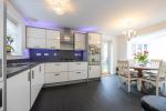 The welcoming entrance hallway leads to a large bay-fronted living room with a contemporary feature fireplace, a dual-aspect study, and a downstairs WC. At the heart of the home is a superb open-plan kitchen, dining, and family room that spans the full width of the house - an ideal space for entertaining. The kitchen is fitted with a range of modern base and eye-level units, complemented by a separate utility room. The bright and spacious family room with double doors leads to the patio and large rear garden.