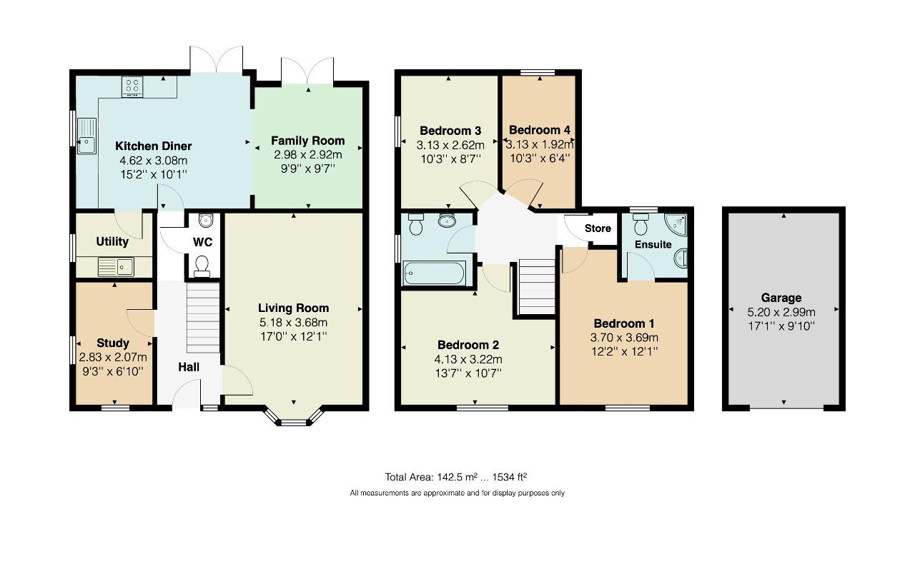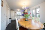 The welcoming entrance hallway leads to a large bay-fronted living room with a contemporary feature fireplace, a dual-aspect study, and a downstairs WC. At the heart of the home is a superb open-plan kitchen, dining, and family room that spans the full width of the house - an ideal space for entertaining. The kitchen is fitted with a range of modern base and eye-level units, complemented by a separate utility room. The bright and spacious family room with double doors leads to the patio and large rear garden.